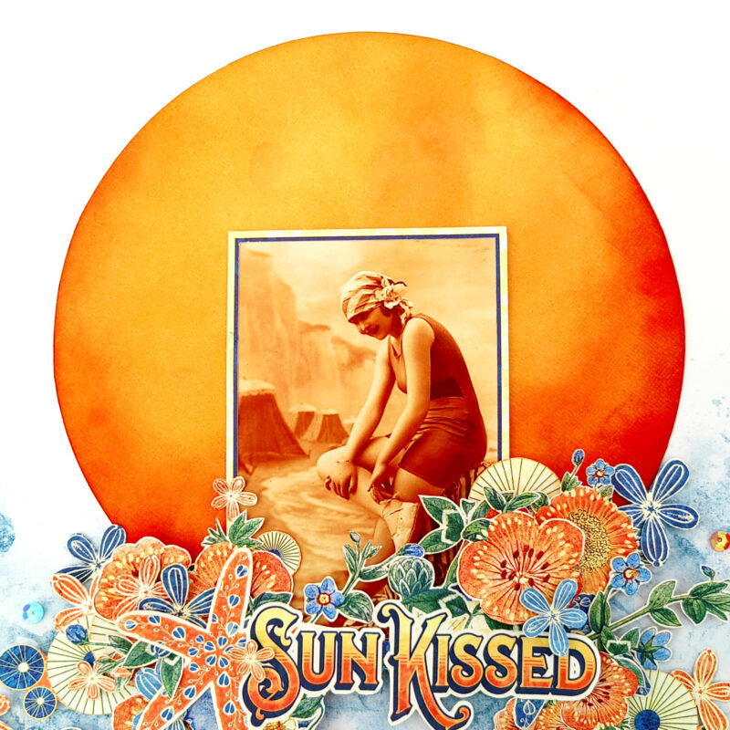 I am happy to share my project this month, a Layout (photo credit to Magic Moonlight Free Images) featuring the STUNNING Graphic 45 Sun Kissed Collector’s Edition.
