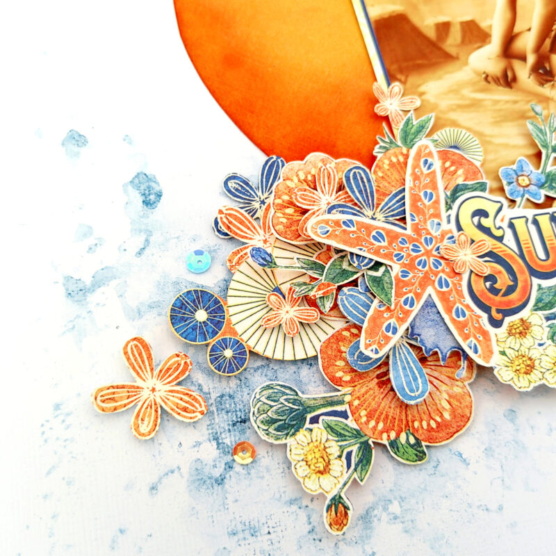 - Glue the ‘sun’ and the photo with the fussy cut pieces onto the page..
