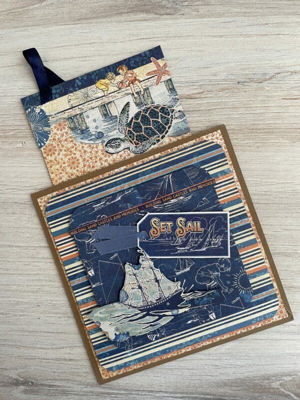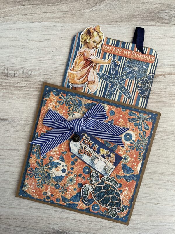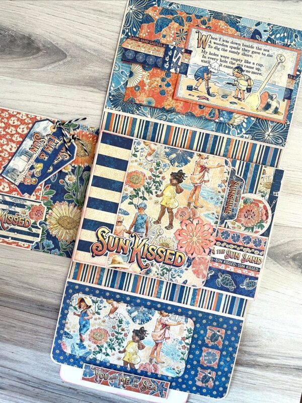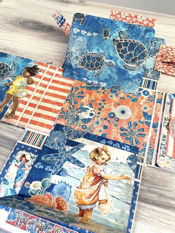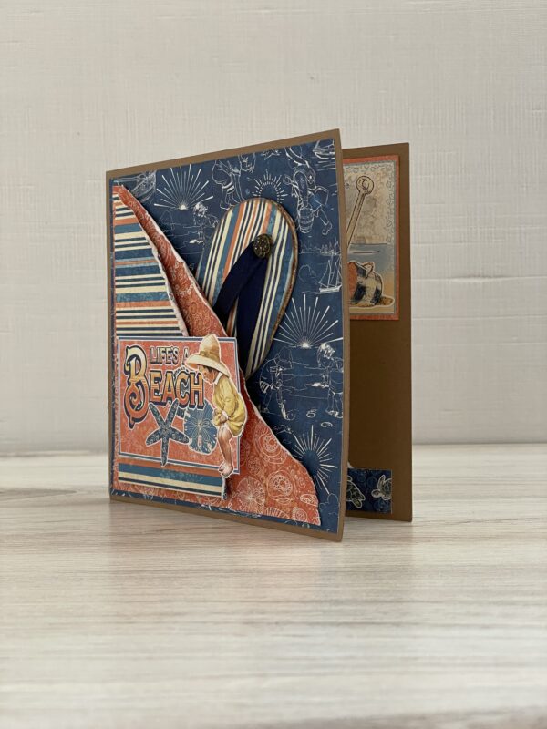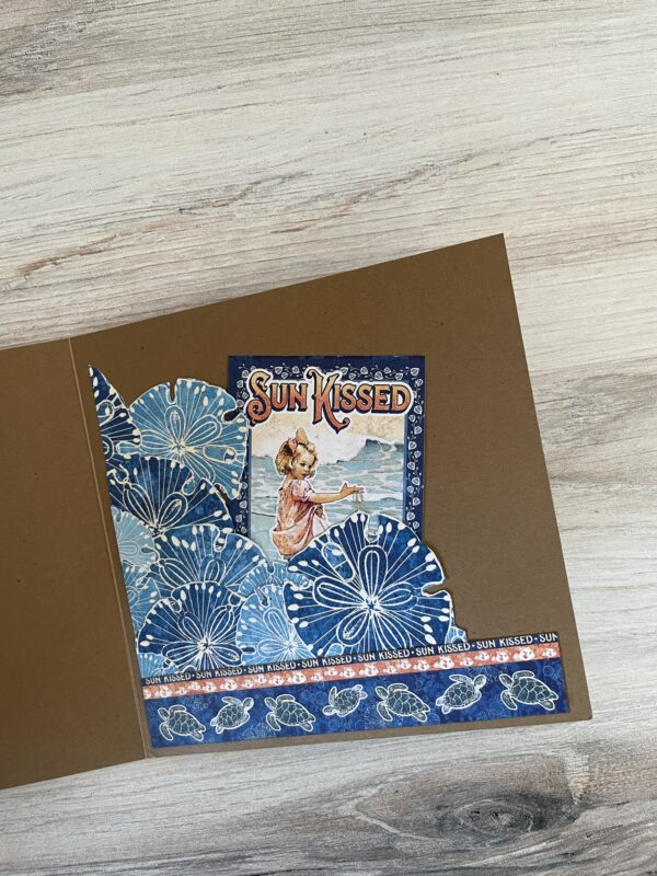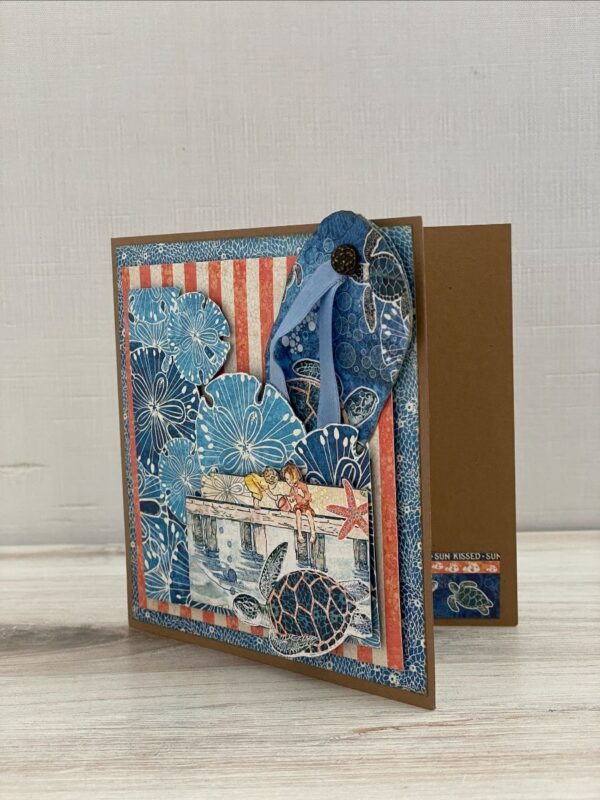 With the season of sunny weather upon us, you’ll love the images and patterns of this Collector’s Edition, Sun Kissed. Seashells, turtles, the ocean, and children playing will pop off the pages of this collection. For this Card Kit, we’re creating flip-flops that open to become mini-cards, pockets, and inter-active slider cards – all things that will remind you of one of our favorite seasons. Have fun creating these detailed cards!