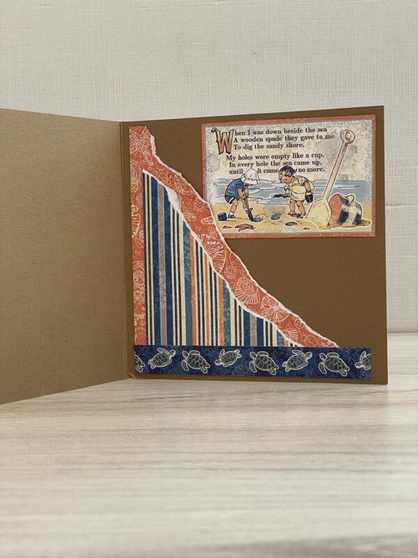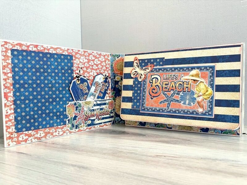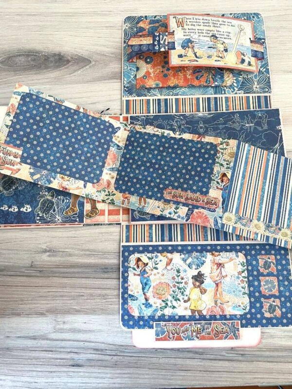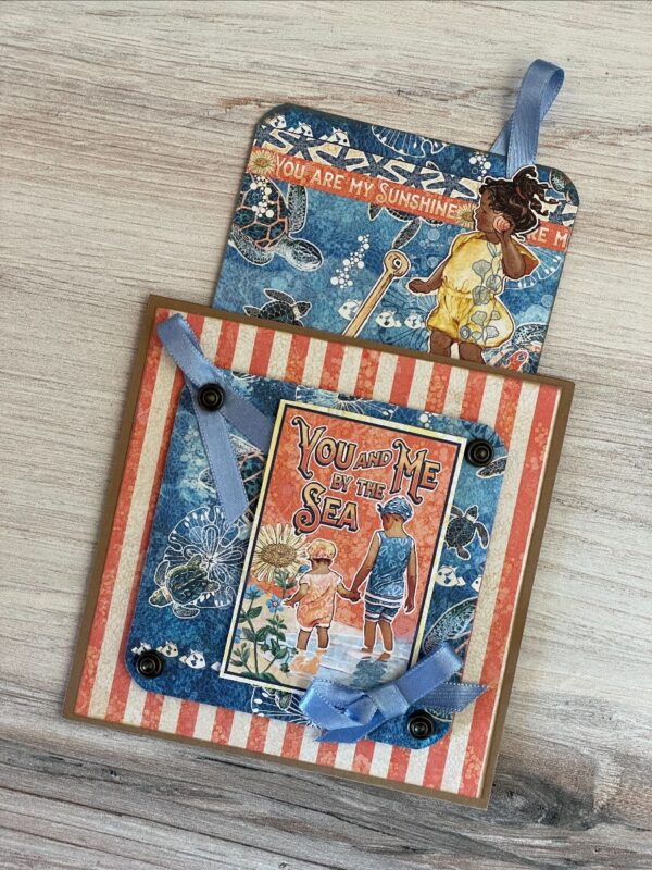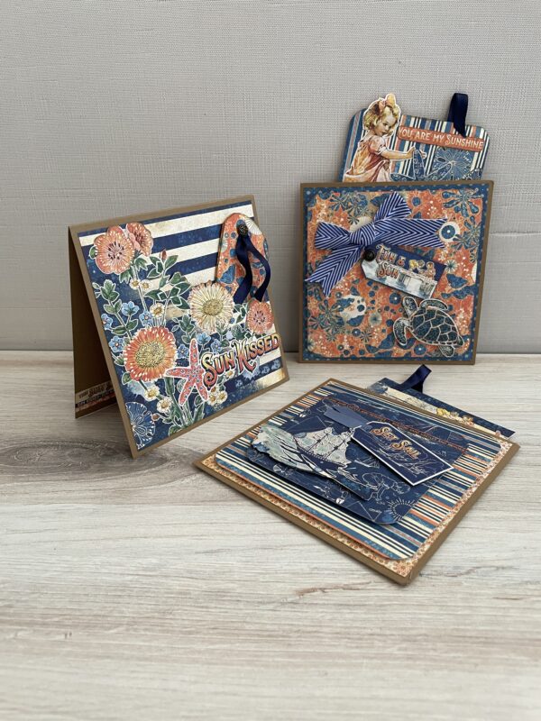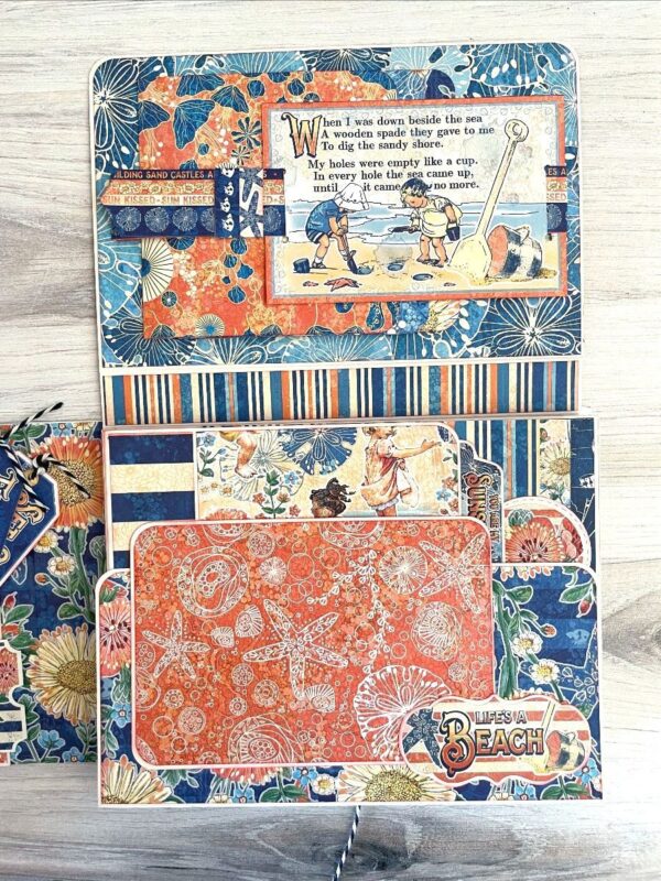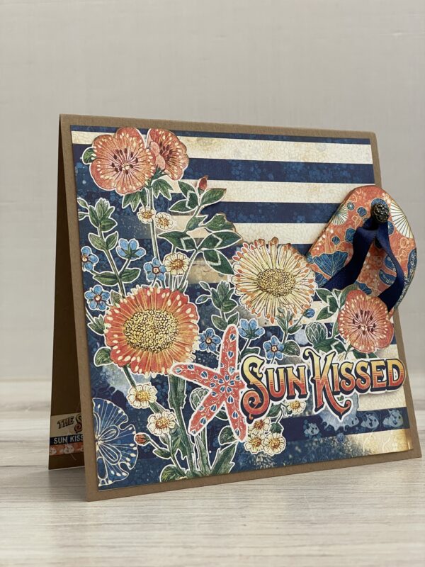 With the season of sunny weather upon us, you’ll love the images and patterns of this Collector’s Edition, Sun Kissed. Seashells, turtles, the ocean, and children playing will pop off the pages of this collection. For this Card Kit, we’re creating flip-flops that open to become mini-cards, pockets, and inter-active slider cards – all things that will remind you of one of our favorite seasons. Have fun creating these detailed cards!