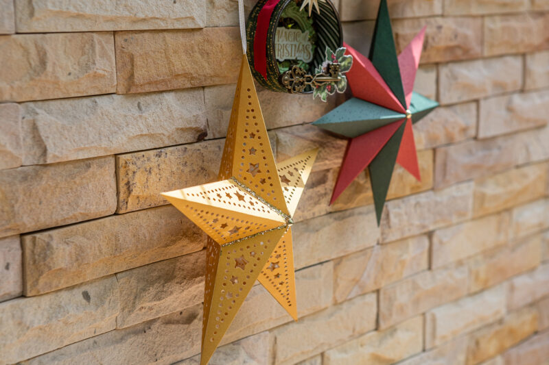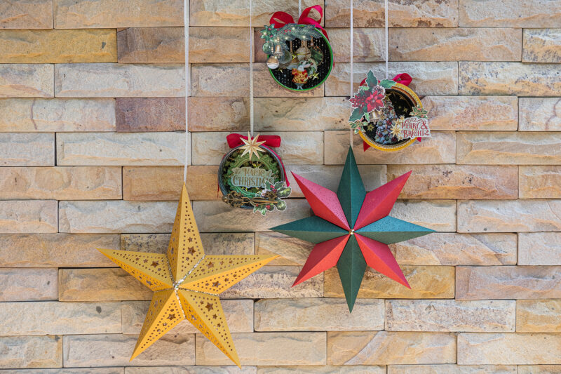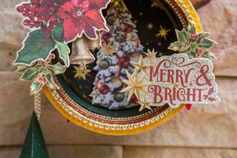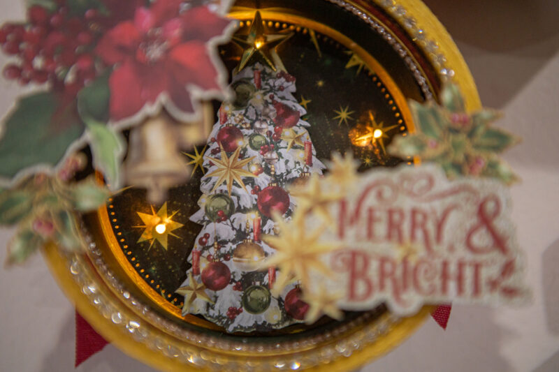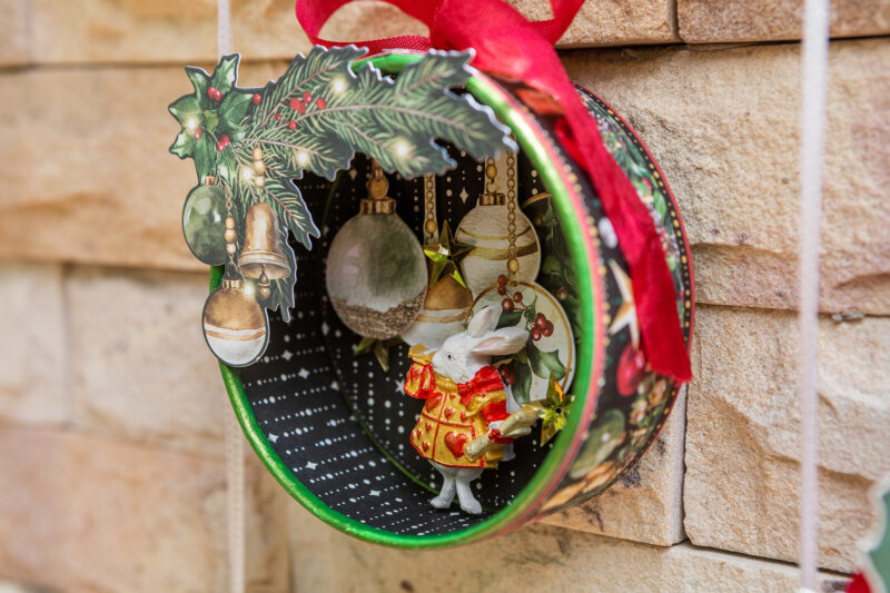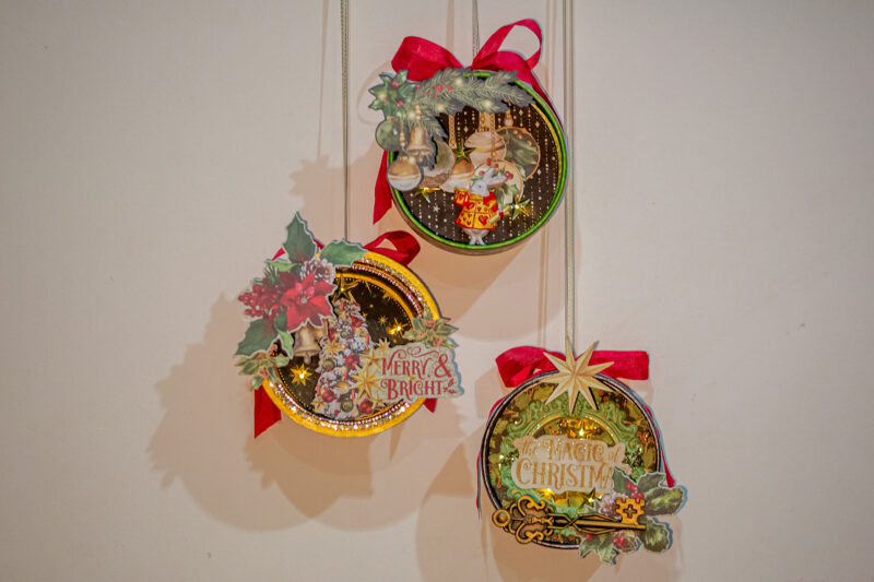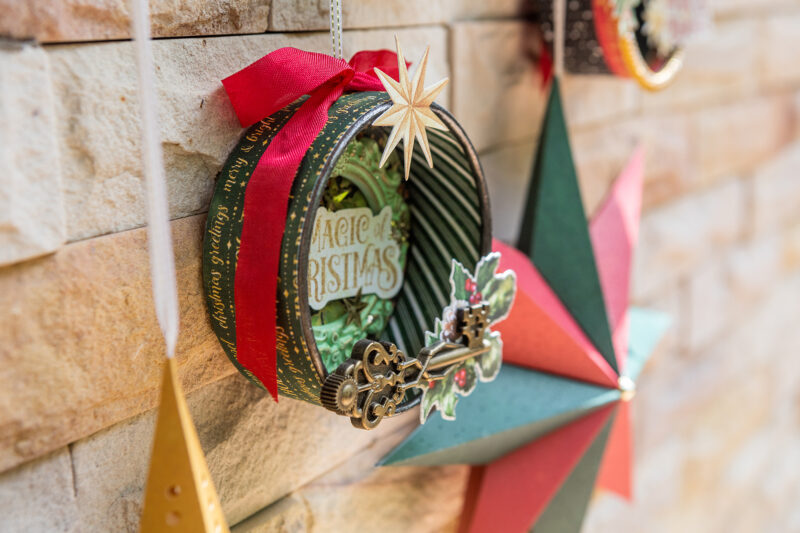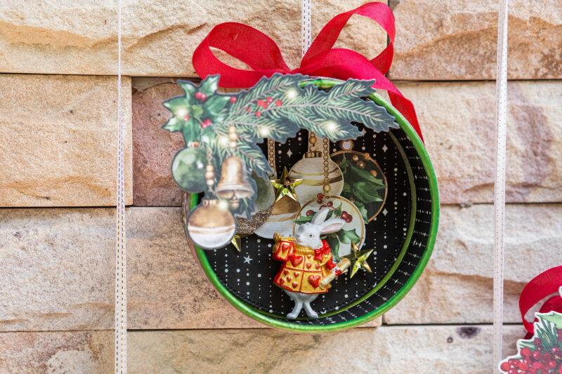 “Hello everyone! Today I want to show you how I’ve made Christmas home decor using the magnificent Graphic 45 Mery & Bright collection. I used a cheese package as the base for the round decor. I used acrylic paints, scrap paper, ribbons and die cuts to create the pendants. But they were given special magic by tiny light bulbs hidden inside. So in the evening my decoration looks so magical! I also wanted to add paper stars to my festive composition. I created them using cutting dies.