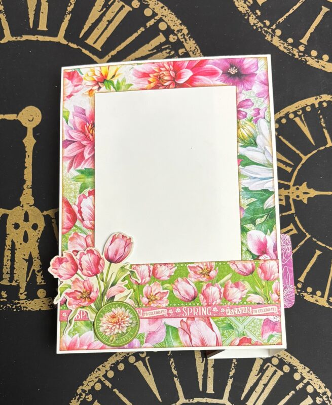 Card #1 – Back – Celebrate Spring Season Card:I chose a border from the Spring Cut Apart and cut it down to 4 ⅞”. I then adhere the bordered strip just at the top of the bottom of the frame. I then foam squared the tulip bunch from the Ephemera pack to the left of the border strip along with using adhesive and foam squares to adhere the floral circle from the Ephemera pack to the right of the tulips.