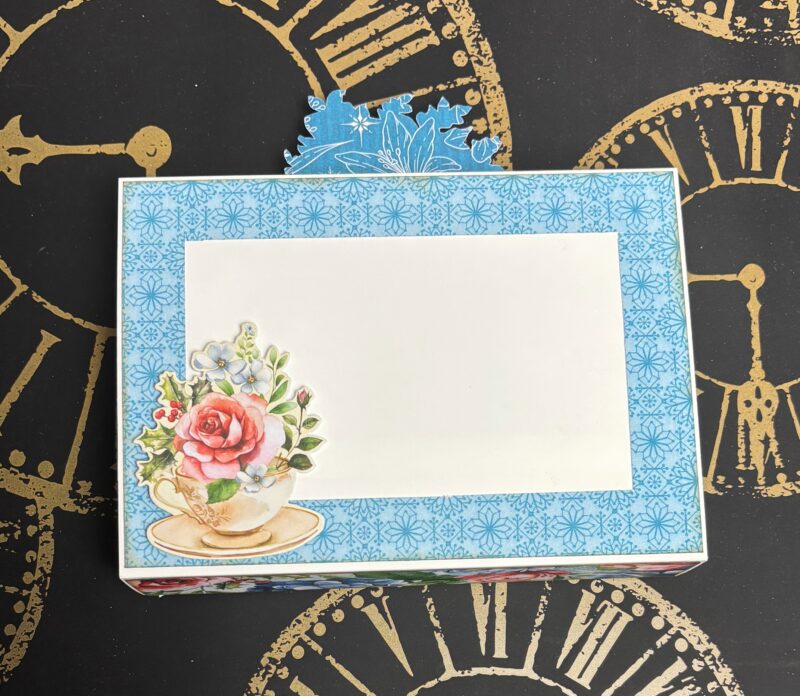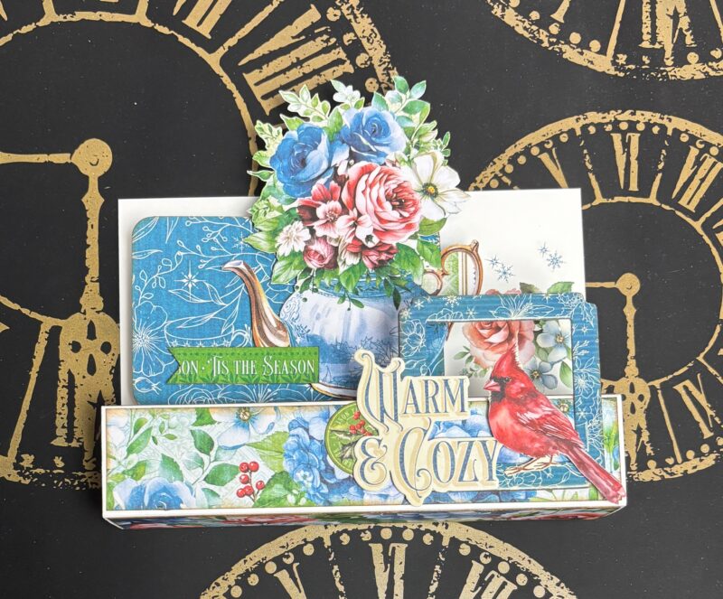 Card #3 – Front – Warm & Cozy Card: On the floral paper that adheres to the pop up piece, I fussy cut the tea cup with flowers in it from the Winter Cut Apart paper and foam squared it to the right side of the floral paper. I cut part of the Tis the Season border strip from the Winter Cut Apart paper down to 2 ¼”, cutting a notch on the left side of the border strip. Use adhesive and foam squares to adhere the Tis the Season strip to the left of the tea cup. Fussy cut around the cardinal from the Ephemera pack and foam square to the bottom right side of the frame. Adhere the Warm & Cozy from the Ephemera pack to the frame as desired. Choose one of the coordinating floral circles and adhere to the left of the Warm & Cozy sentiment as desired.