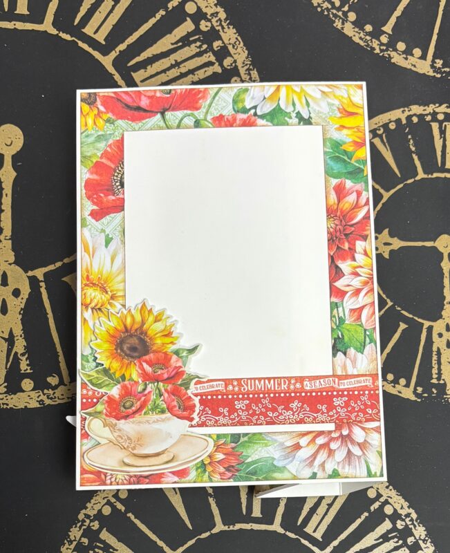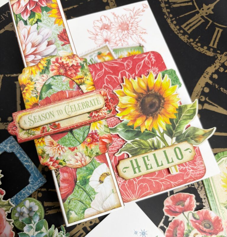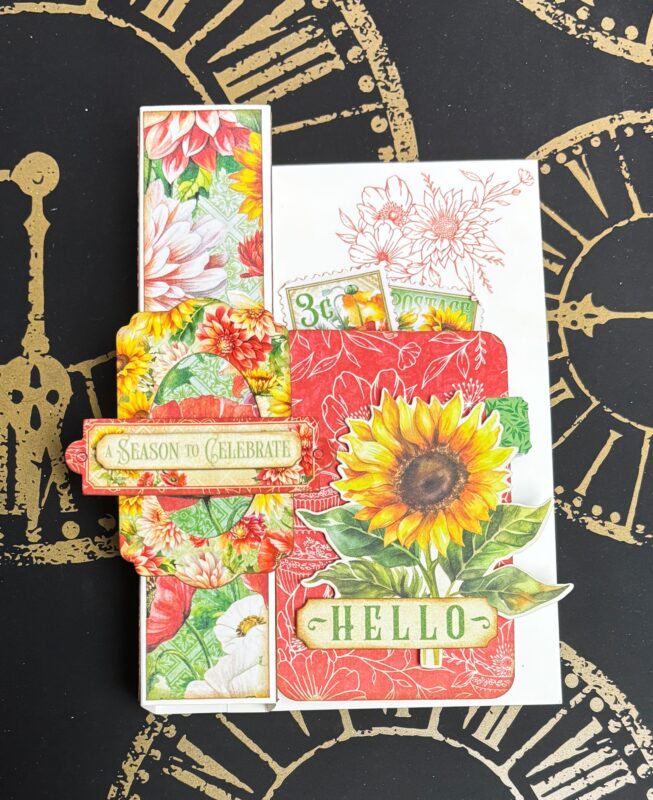 Card #2 – Front – Hello Card: On the floral paper that adheres to the pop up piece, I added a tab to the right side of the floral paper. On the same floral piece, I foam squared the sunflower from the Ephemera pack along with adhering the Hello sentiment from the Ephemera pack to the bottom of the sunflower. Behind the pop up I fussy cut two stamps from the Summer Cut Apart and adhered them. On top of the chipboard frame, I layered one of the summer chipboard banners on top of the frame and then foam squared the Season to Celebrate chipboard label on top of the banner.