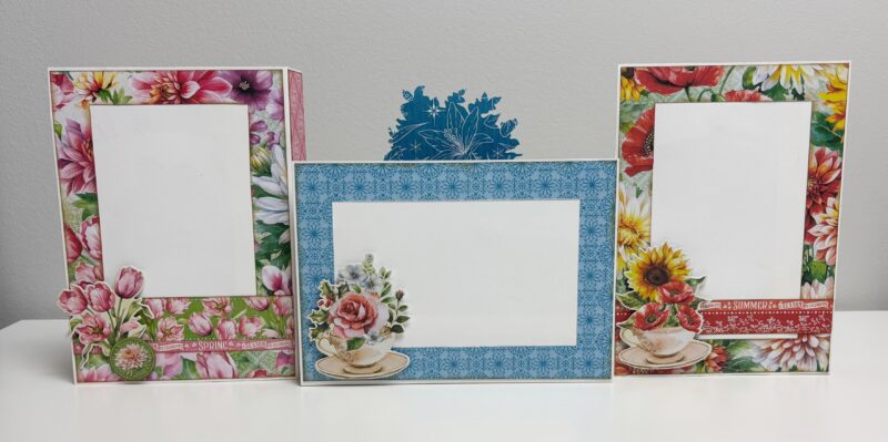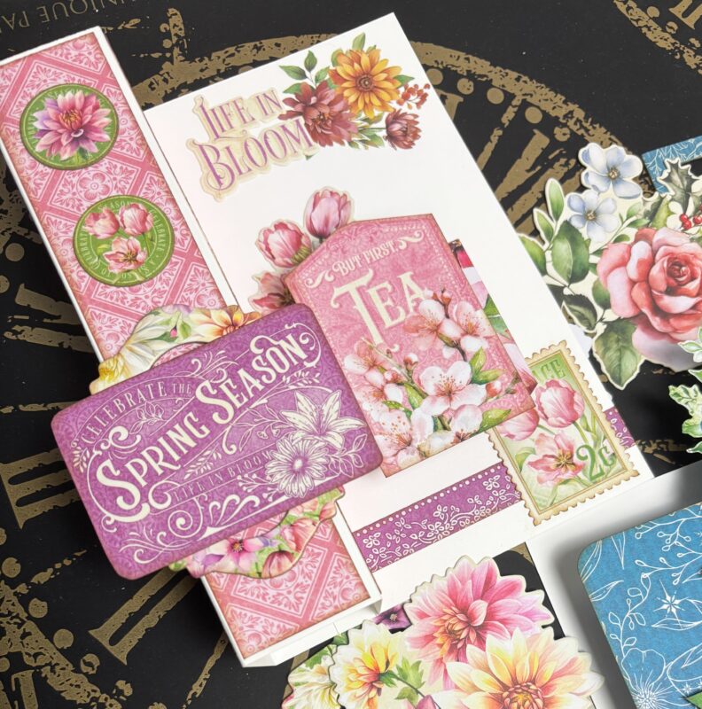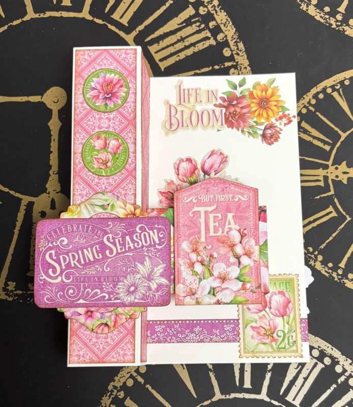Card #1 – Front – Celebrate Spring Season Card: Instead of doing a rub on the bottom of the card, I cut a border from the Spring Cut Apart paper that measures 3 ¾” and adhered ½” from the bottom of the card. From the same cut apart paper, I fussy cut one of the stamps and adhere to the bottom right of the card. To the left of the floral rub on, I used the Life in Bloom Sticker from the Season to Celebrate Cardstock Stickers. On the pop up piece, I foam squared the But First Tea which I fussy cut from the Spring Cut Apart. Behind the pop up I adhere the tea cup with matching flowers from the Season to Celebrate Ephemera. On the portion that the chipboard frame adheres to, I added two circles with coordinating flowers from the Ephemera pack above the frame. The Celebrate Spring Season piece comes from the Spring Cut Apart.