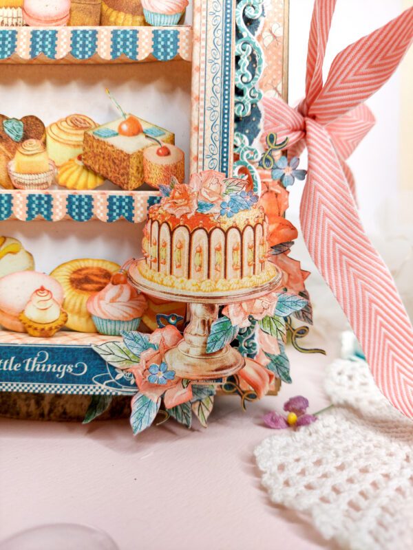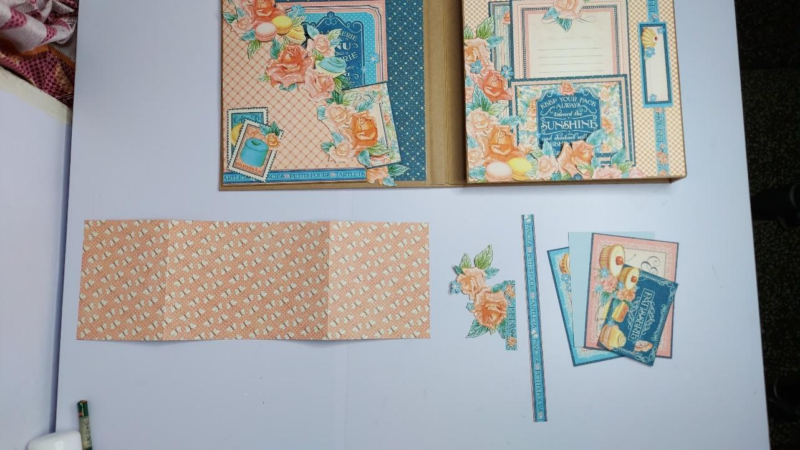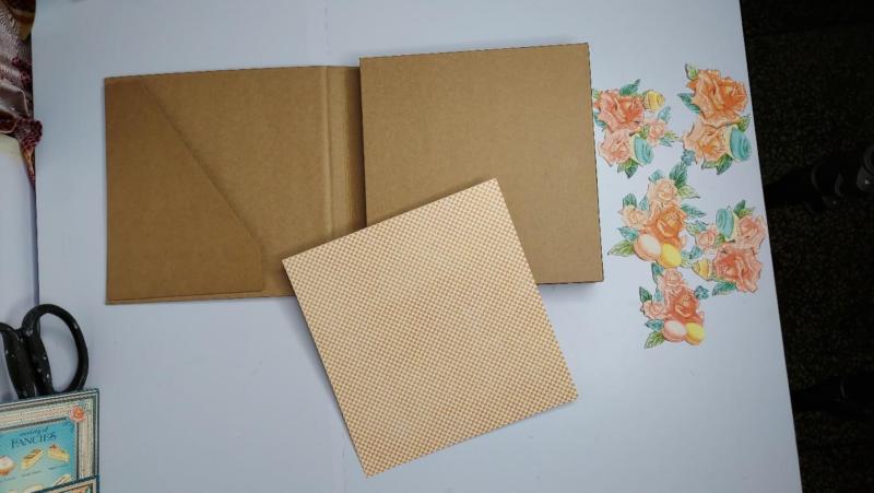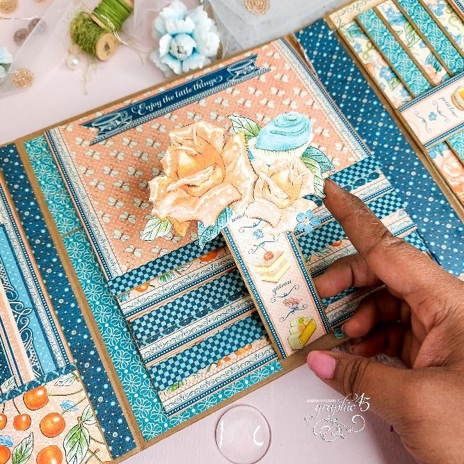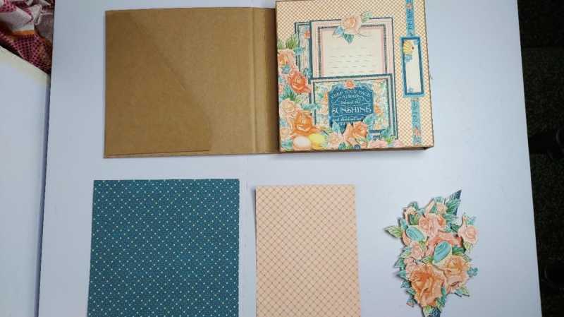 I have covered the page using the 7 1/8” * 7 3/8” pattern paper and made a tuck in pocket using the floral fussy cut outs from the collection. I have used the floral cut outs to make the pockets.