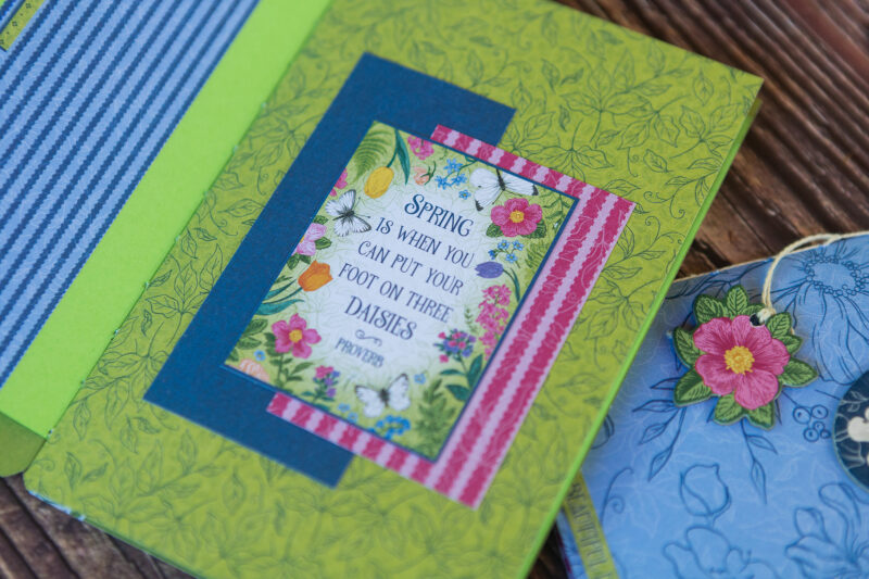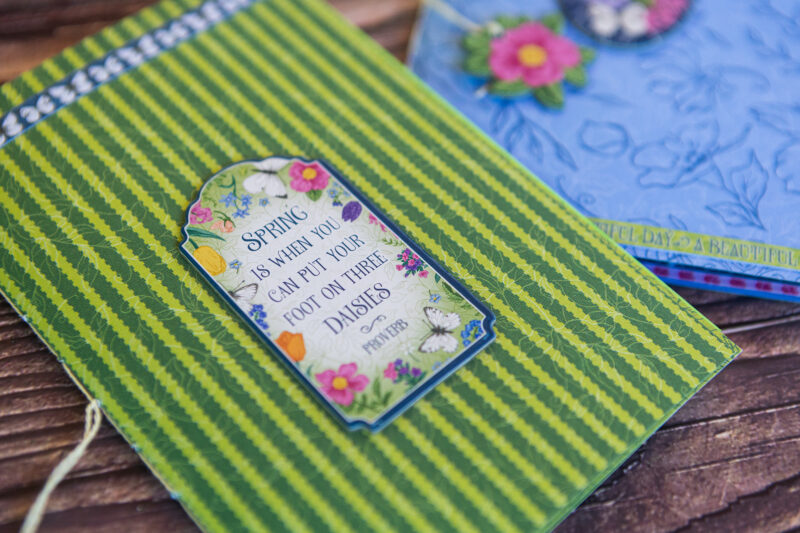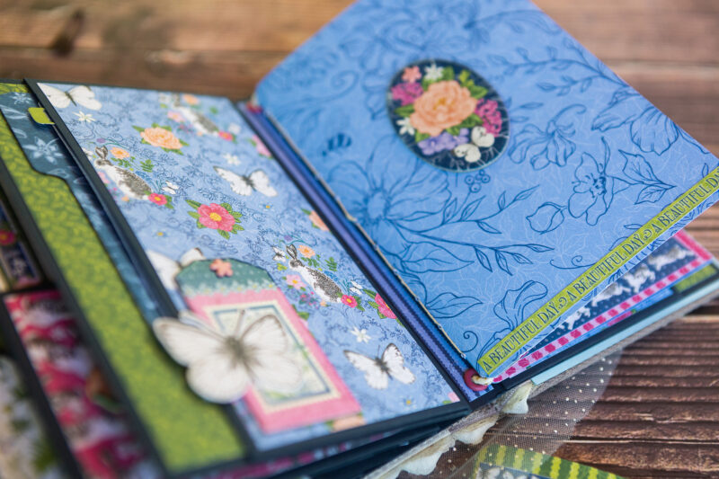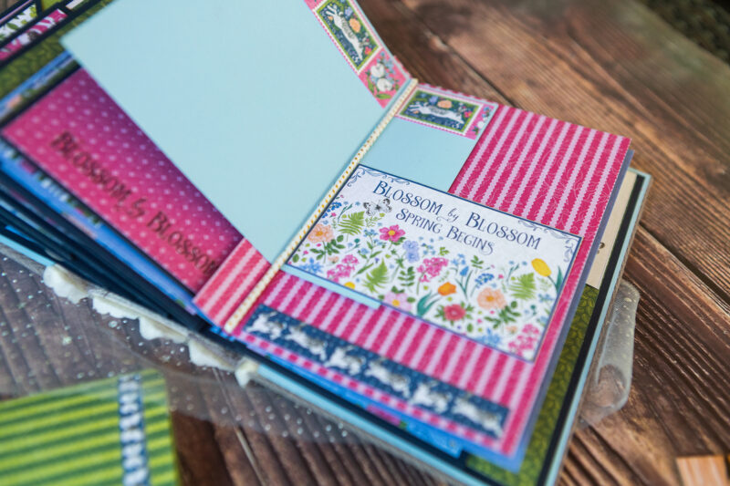 I made two signatures using the “Grow with Love” collection by Graphic 45. The papers are bursting with florals, butterflies, and positive quotes — perfect for capturing spring’s fresh, colorful energy. To add more personality, I decorated the covers with rub-ons and paper leftovers. Each signature holds plenty of space for journaling, photos, and interactive elements.