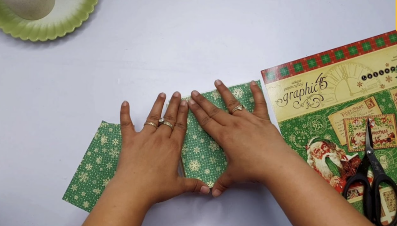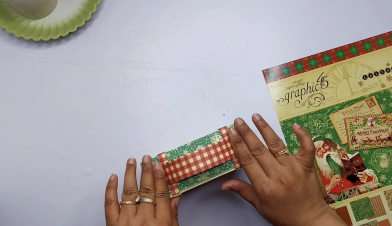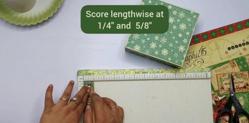 I took contrasting pattern paper now and cut the strip of 1 inch long. This I scored at ¼” and 5/8”, folded, scored and pasted to make a thin strip.