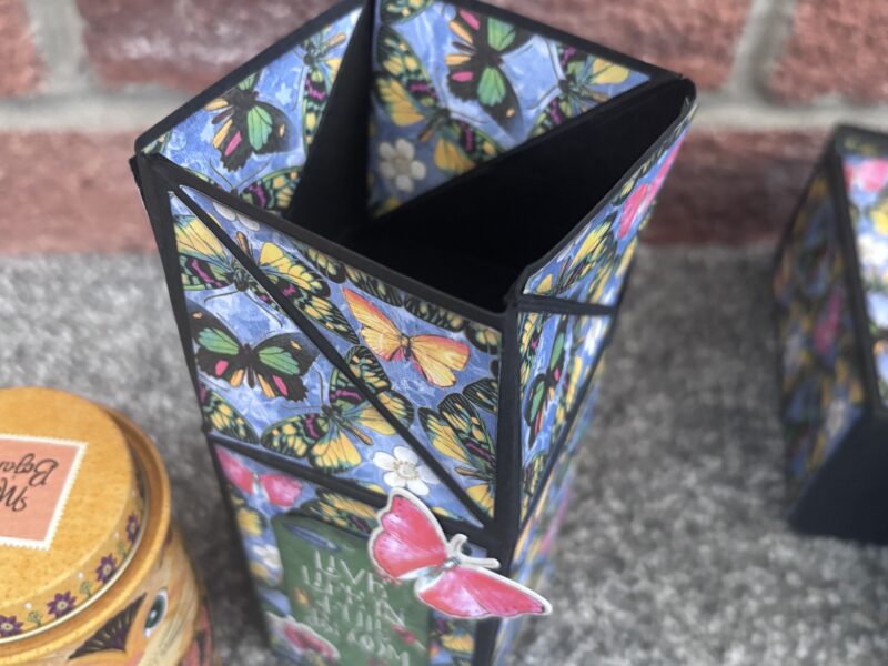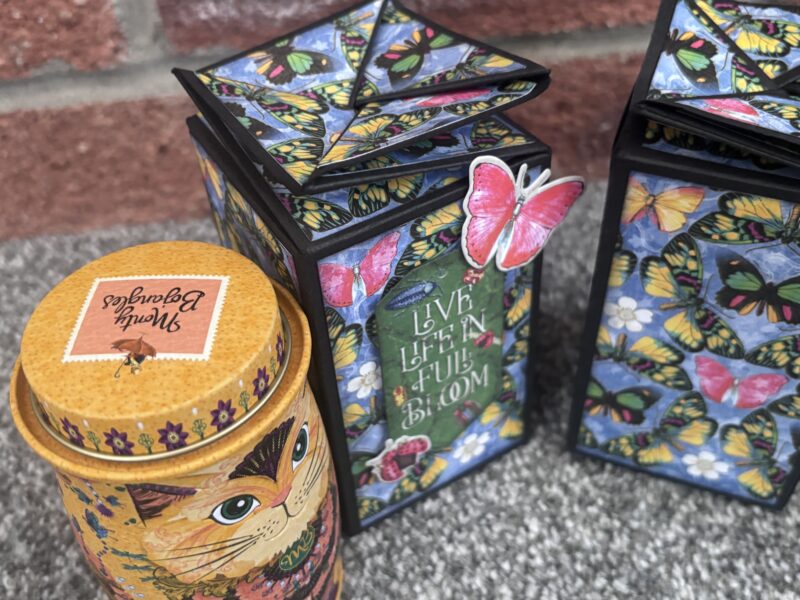 “Welcome back for my next Brand Ambassador project. This time I’m going easy, 3D for a #SimplyG45 idea for you! This is a twisted lid box that is a nice packaging for treats and gifts. The Flutter papers were ideal for these little tins of chocolates – perfect colour match! These may look complicated but in fact, they are super easy and once you see the mechanism, you can adjust to any size you wish.” ~Paul Ford