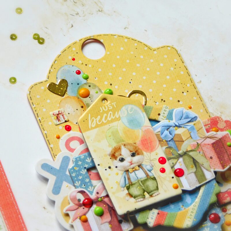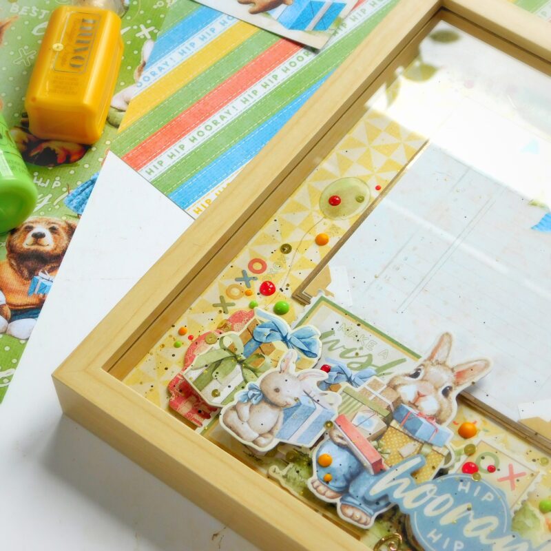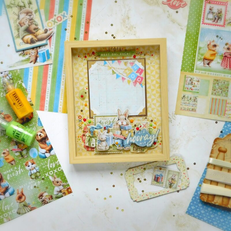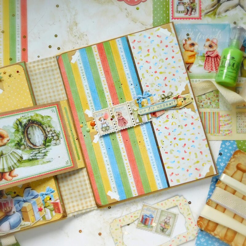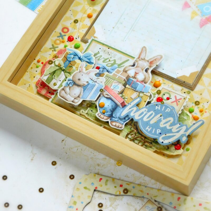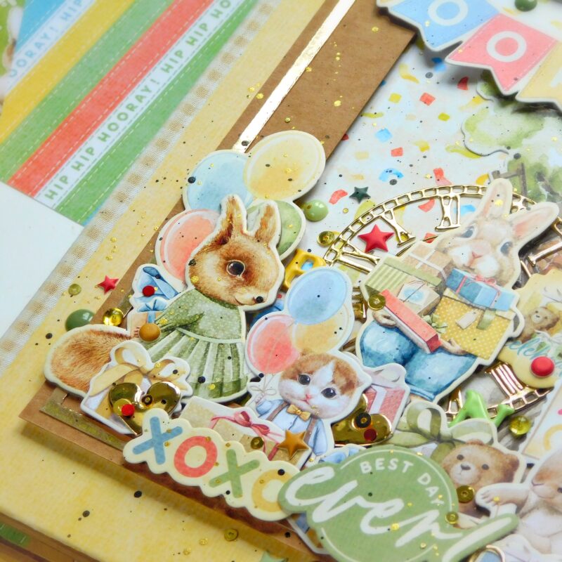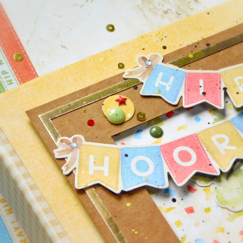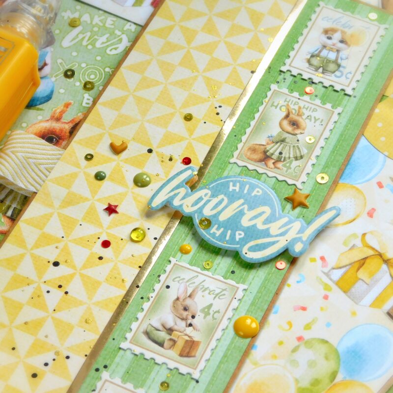 This time, I was creating with the incredibly sweet and cheerful Hip Hip Hooray collection featuring Graphic 45, and I truly enjoyed every bit of it—from the stunning paper pads to the fabulous rub-ons.